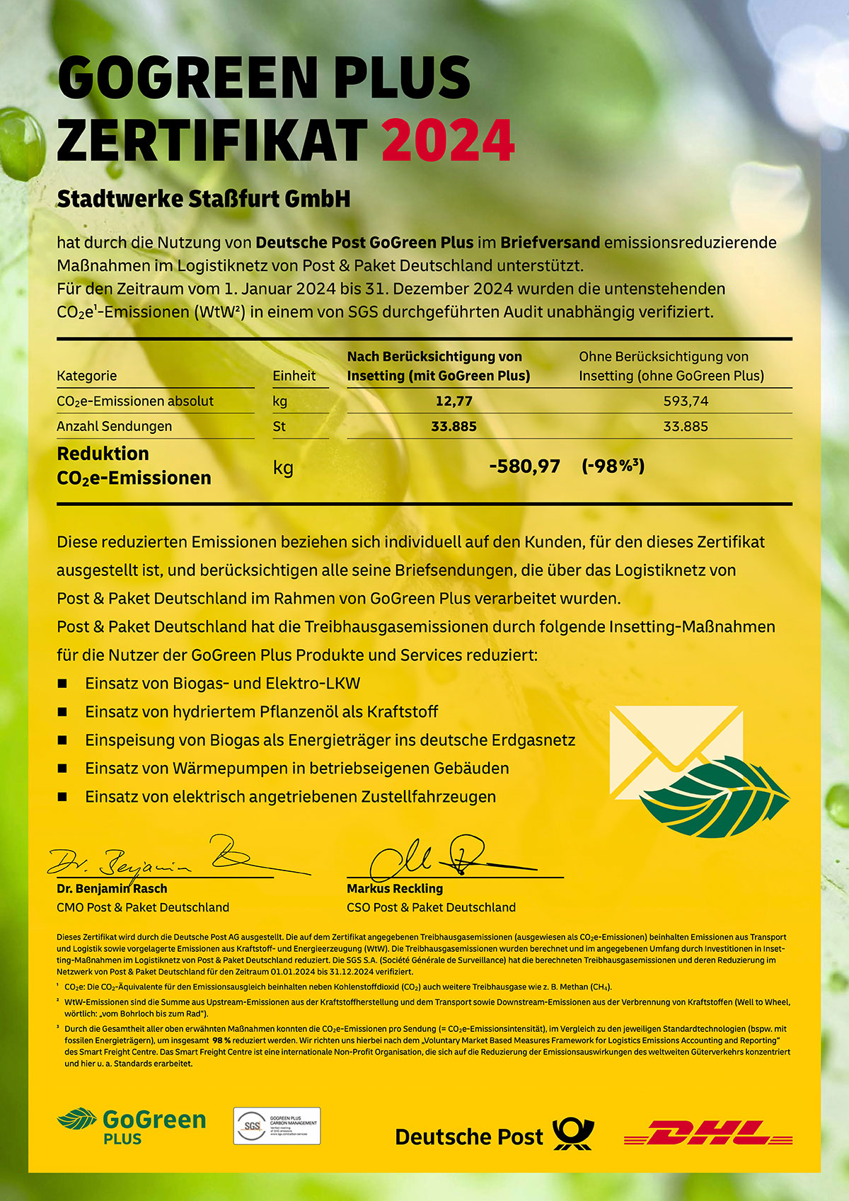 GoGreen Plus Zertifikat 2024: Stadtwerke Staßfurt versenden klimafreundlich